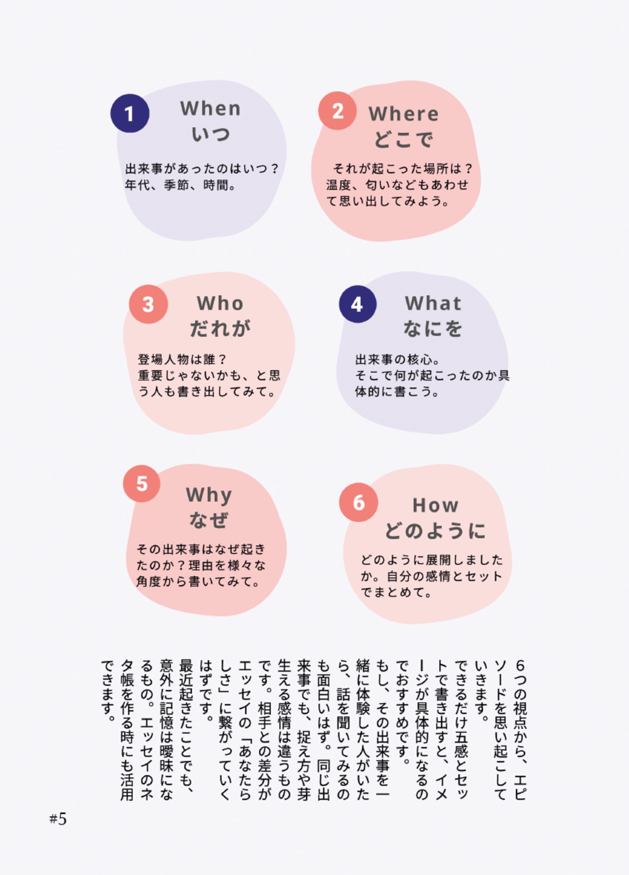 5W1Hを活用した6つの視点で掘り下げる方法を紹介しながら、この手法を用いて集められたエピソードをエッセイに編集してお届けします。